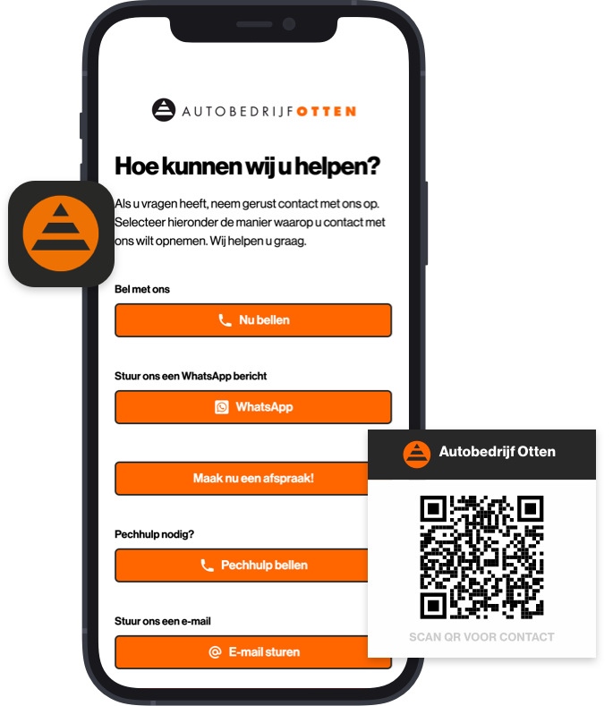 - U ontvangt van ons QR stickers in uw eigen huisstijl die u in het voertuig kunt plaatsen. Bijvoorbeeld op de zonneklep of een andere zichtbare plek. Uw klant scant vervolgens de QR-code en neemt contact op via een medium dat u heeft ingesteld. Telefoon, Whatsapp, Pechhulp, Facebook, e-mail of laat de klant direct doorlinken naar uw online planner.
