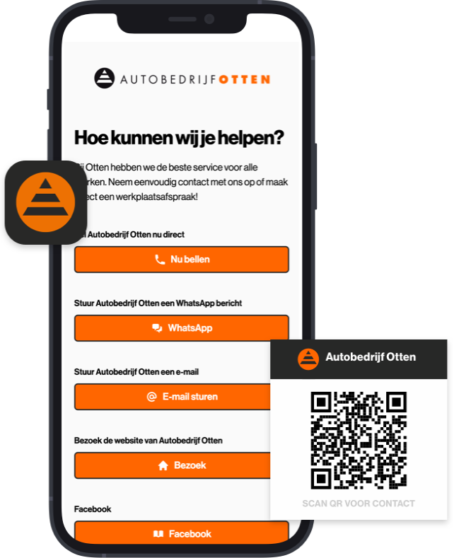De QR Contact Tool is een unieke tool waardoor uw klant razendsnel contact met u kan opnemen. Scan de QR-code en maak van de tool uw eigen Web App in enkele seconden. Zo heeft uw klant een no-nonsense App van uw autobedrijf waarmee direct contact kan worden opgenomen via elk medium dat u heeft ingesteld. Telefoon, WhatsApp, Facebook, e-mail of laat de klant direct doorlinken naar uw online planner. U kunt de QR-codes plaatsen op sleutelhangers, smeerkaartjes of bijvoorbeeld de zonneklep van een auto.
